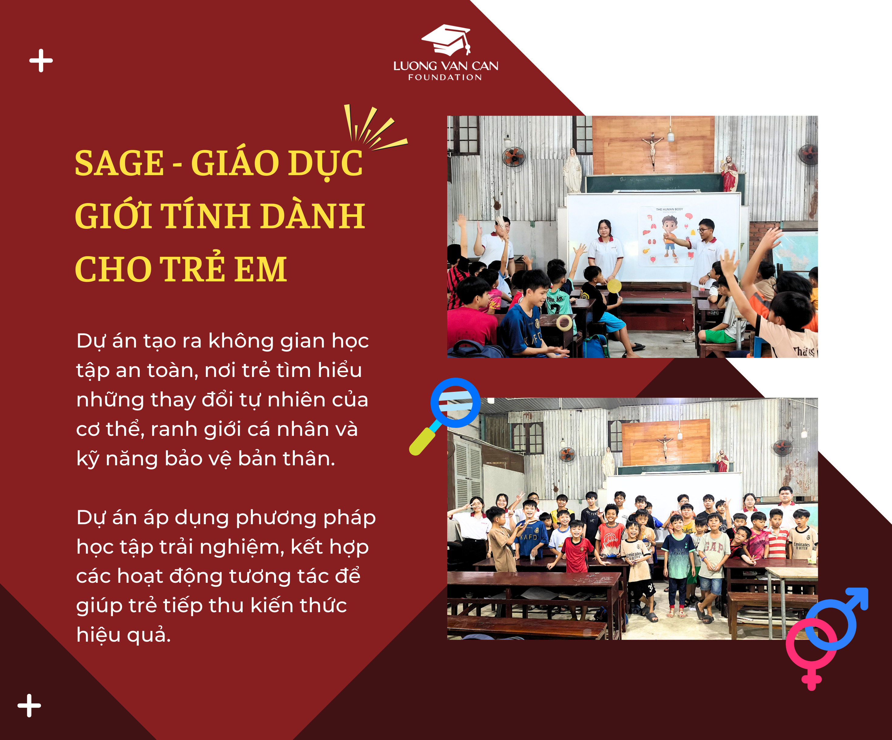 Đối với trẻ em tại các mái ấm tình thương, rào cản này càng lớn hơn khi các em ít có cơ hội tiếp cận thông tin chính xác về sự phát triển cơ thể, giới tính và quyền riêng tư. Nhận thức được điều đó, dự án SAGE ra đời nhằm tạo ra một không gian học tập an toàn, nơi trẻ có thể tìm hiểu về những thay đổi tự nhiên của cơ thể, ranh giới cá nhân và trang bị kỹ năng bảo vệ bản thân. Sau khi triển khai hoạt động dành cho trẻ em cấp 1 và cấp 2 tại Mái ấm Mai Thôn, dự án đã giúp khoảng 80% em tham gia cởi mở chia sẻ các vấn đề về giới tính.
