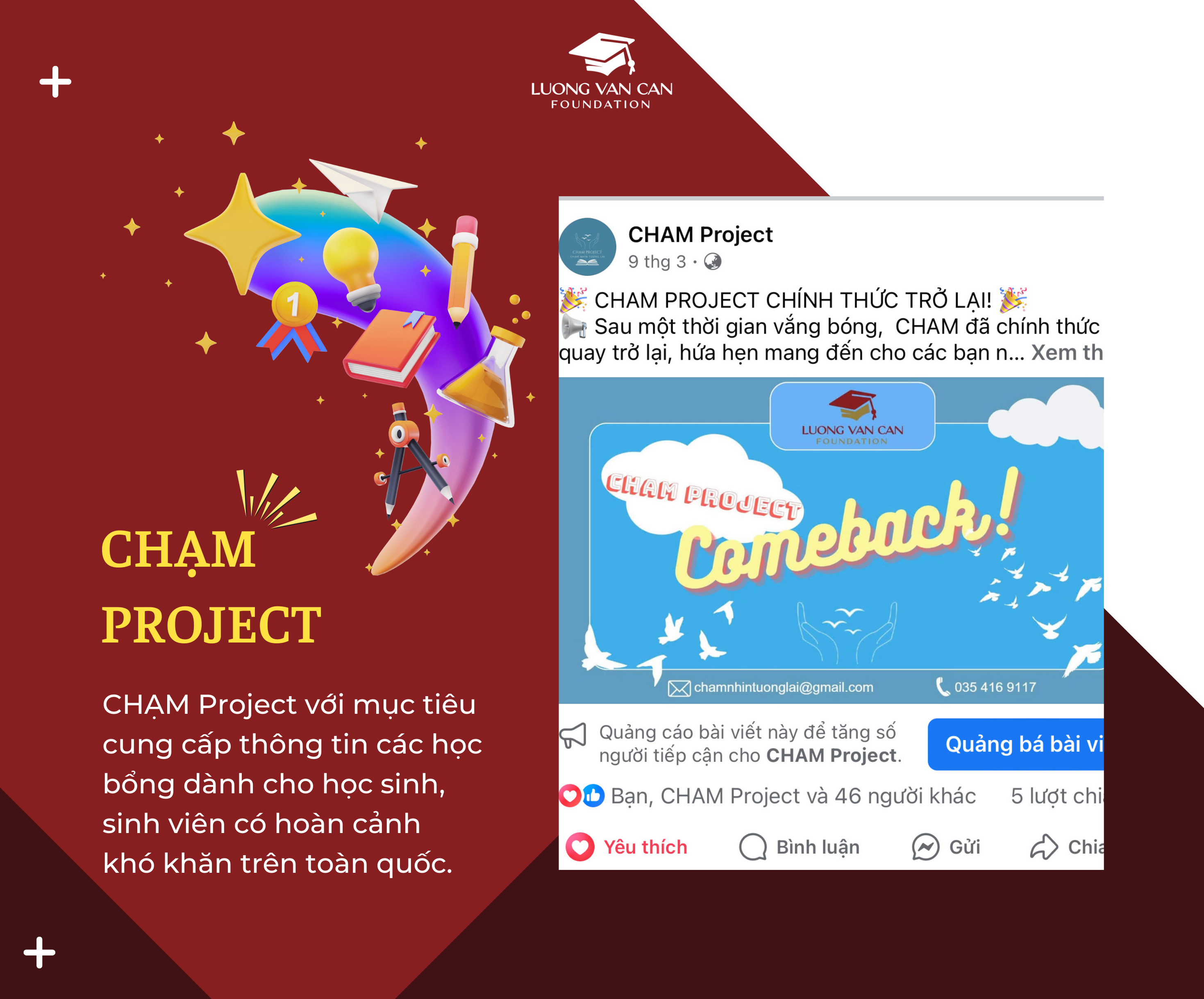CHAM Project – tên đầy đủ là “Chạm nhìn tương lai” là dự án được thành lập với mục tiêu cung cấp thông tin các học bổng dành cho các bạn học sinh, sinh viên có hoàn cảnh khó khăn trên toàn quốc. Bên cạnh đó, dự án còn hỗ trợ tư vấn, định hướng để các bạn có thể hoàn thiện hồ sơ học bổng và tiếp tục theo đuổi ước mơ, hoài bão của mình.