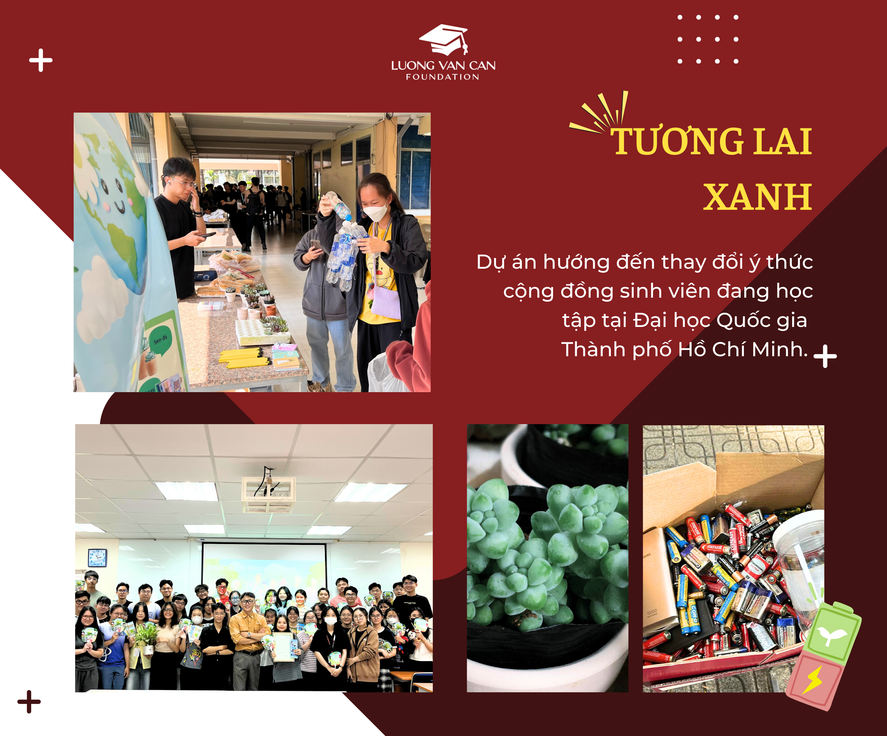 Dự án Tương lai Xanh hướng đến thay đổi ý thức cộng đồng sinh viên tại Đại học Quốc gia Thành phố Hồ Chí Minh. Dự án bao gồm chuỗi hoạt động thu gom pin cũ tại Trường Đại học Khoa học Tự nhiên – ĐHQG TP.HCM, phân loại & tái chế rác thải, tổ chức workshop và truyền thông trên mạng xã hội.